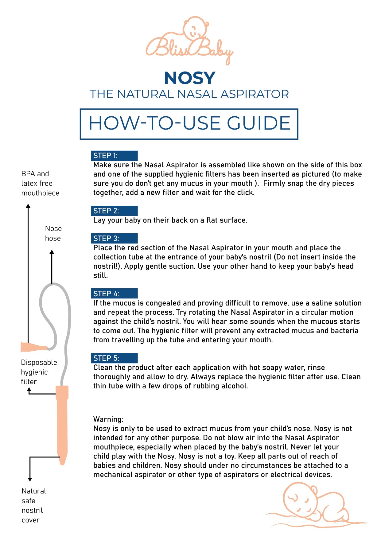 Nosy is only to be used to extract mucus from your child’s nose. Nosy is not intended for any other purpose. Not intended for ear or throat use. Before applying suction take caution to avoid accidental inhalation or swallowing of the mouthpiece. Do not blow air into the Nasal Aspirator mouthpiece, especially when placed by the baby’s nostril. Never let your child play with the Nosy. Nosy is not a toy. Keep all parts out of reach of babies and children. Nosy should under no circumstances be attached to a mechanical aspirator or other type of aspirators or electrical devices.