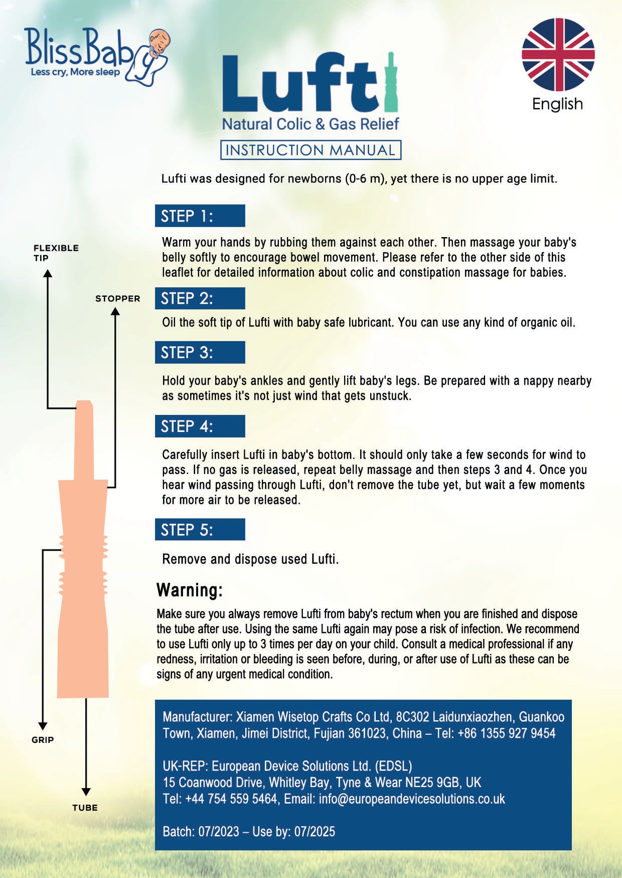 👶 PARENTS LOVE LUFTI - Over 10,000 Luftis have already been sold. Check out the reviews on amazon. With each purchase you receive 10 colic relievers, a how-to-use guide and massage tips to help relieve your baby from colic & constipation.